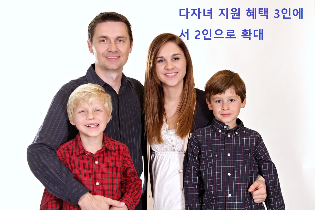 저출산으로 인해 심각한 사회적 문제가 되고 있습니다 그래서 정부가 발표한 정책은 다자녀 대상을 기존 3인에서 2인으로 기준을 완화하여 더 많은 혜택을 받을 수 있도록 한다는 것입니다.