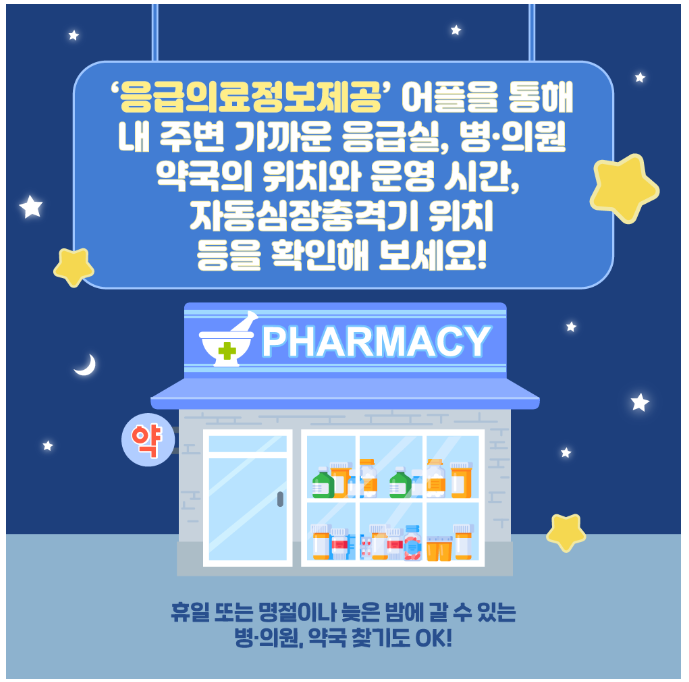 응급의료정보제공, 병원안내, 약국안내, 진료병원, 명절(설, 추석)병원/약국, 연휴병원/약국, 응급처치, 자동심장충격기 등 정보 제공