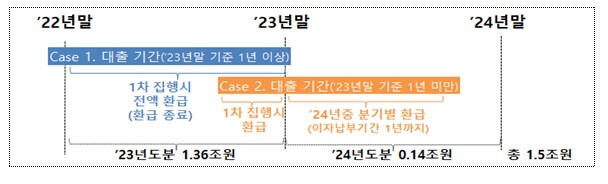 2023년 말까지 이자를 납부한 가긴이 1년 이상이신 분은 최초 집행 시 환급예정액을 전액 돌려받으며 환급이 종료되며 1년 미만이신 분은 작년에 납부한 이자분에 대해서 최초 집행 시에 환급받고 24년에 납부한 이자분에 대해서는 최대 1년까지 분기별로 환급받게 됩니다. 최초환급일은 2월 5일에서 2월 8일까지이며 이자 환급에 대한 별도인 신청은 없으며 sms 또는 앱푸시 등을 통해서 대상자에게 이자환급 금액과 일정 등을 안내합니다.