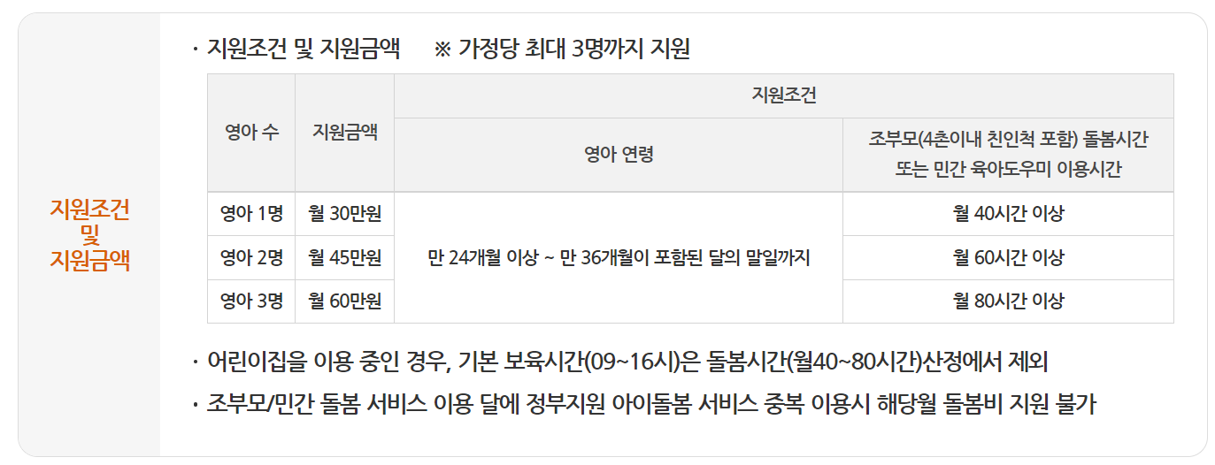그리고 할아버지 할머니가 없거나 친인척이 지원하기 어려워 민간 아이 돌봄 서비스를 원하신다면 서울시가 지정한 서비스 제공기관을 이용할 수 있도록 월 30만 원 상당의 이용권을 지급하기도 합니다.