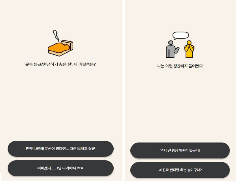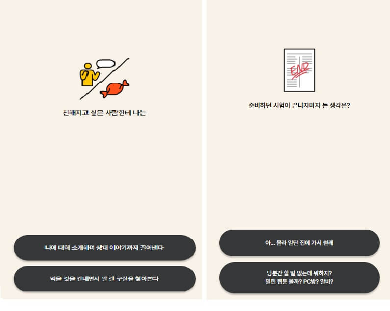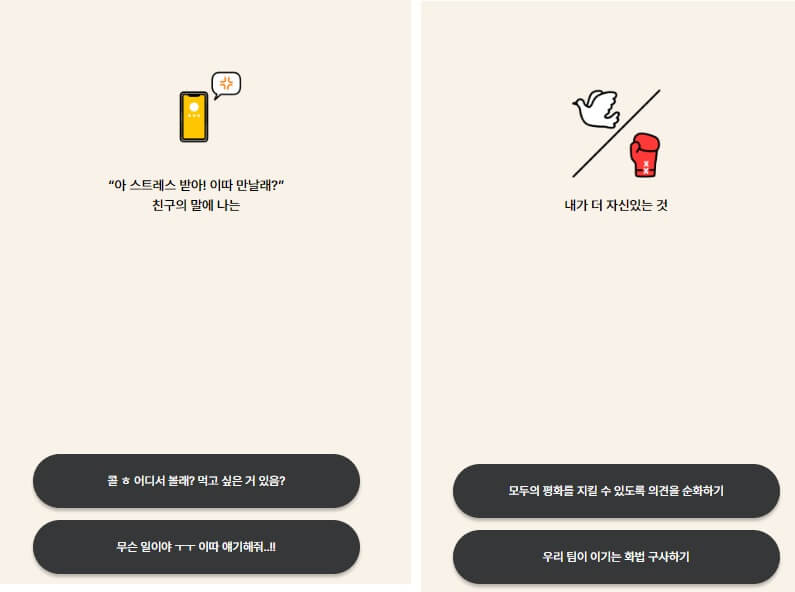 자 처음질문부터 난관이네요. 저는 성격상 친구야 네가 스트레스받은걸 나보고 어쩌라고 하며 그냥 무시하는 경향이 있는데 그 답변은 없습니다. 좀 선택지가 많았으면 좋겠네요. 단 두 가지 답변으로 테스트한다니 나를 뭘로 보는 거야? 저는 그래도 들어주는 거는 좀 할 줄 알아서 이따 얘기해 줘를 선택하였습니다. 두 번째는 모두의 평화와 우리 팀의 선택이네요 그냥 이거는 모두의 평화를 선택했습니다. 전쟁이 사라지기를 바라며 살표시 클릭 완료