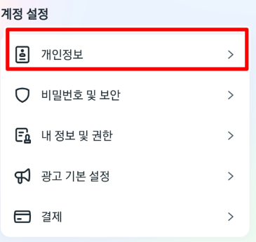 계정 센터 선택하기 : '계정 센터'를 선택한 후, '개인정보'를 클릭합니다.