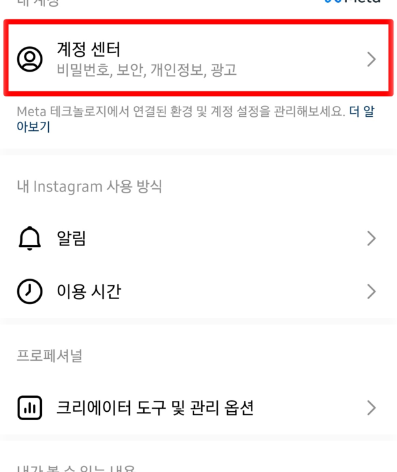 계정 센터 선택하기 : '계정 센터'를 선택한 후, '개인정보'를 클릭합니다.