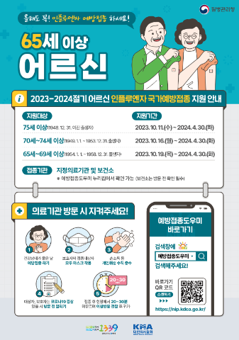 만 75세 이상의 어르신들은 2023년 10월 11일부터 24년 4월 30일까지 예방접종이 가능합니다.
