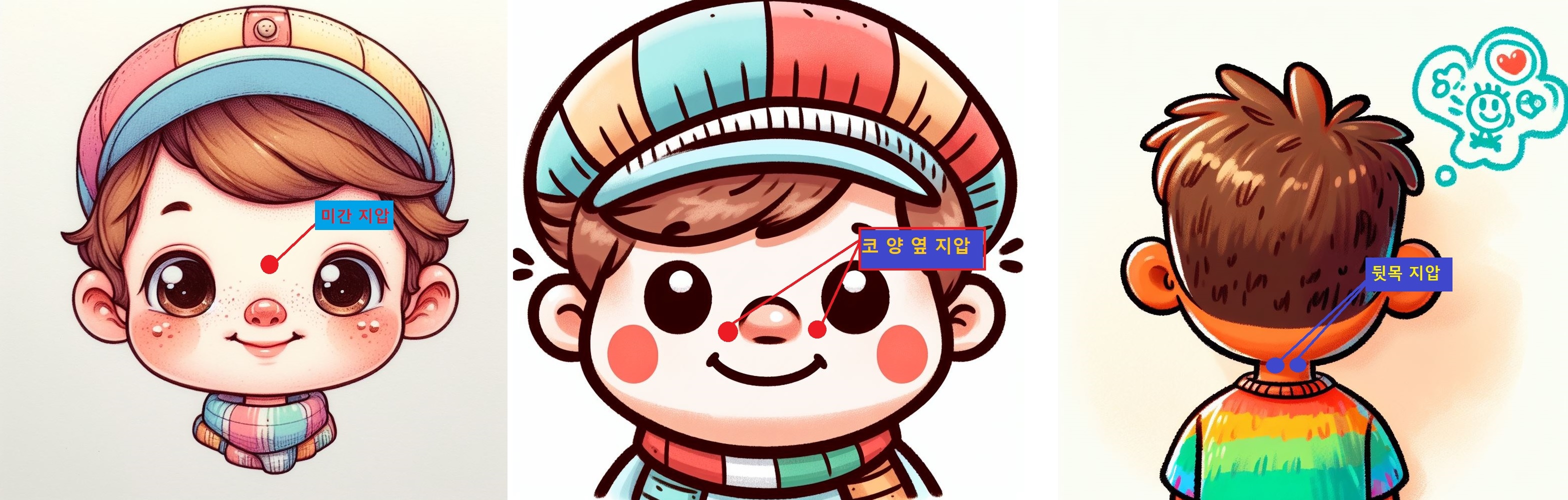 지압을 통한 방법은 혈을 마사지해 줌으로써 혈액순환을 좀 더 원활하게 해서 혈관이 팽창하는 것을 완화해 주는 효과가 있습니다. 대표적인 방법으로는 다음과 같습니다.