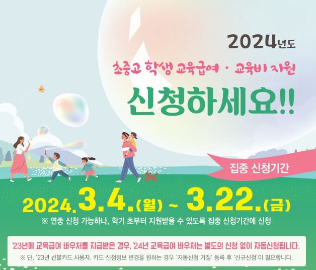 교육급여 바우처의 신청 기간은 연중 신청이 가능하지만 학용품과 교과서비 등 많은 비용이 학기 초에 들어가기 때문에 24년 3월 4일부터 3월 22일까지 집중신청기간으로 운영하고 있습니다. 23년에 교육급여 바우처를 지급받으신 경우에는 24년도에는 자동으로 신청이 됩니다.