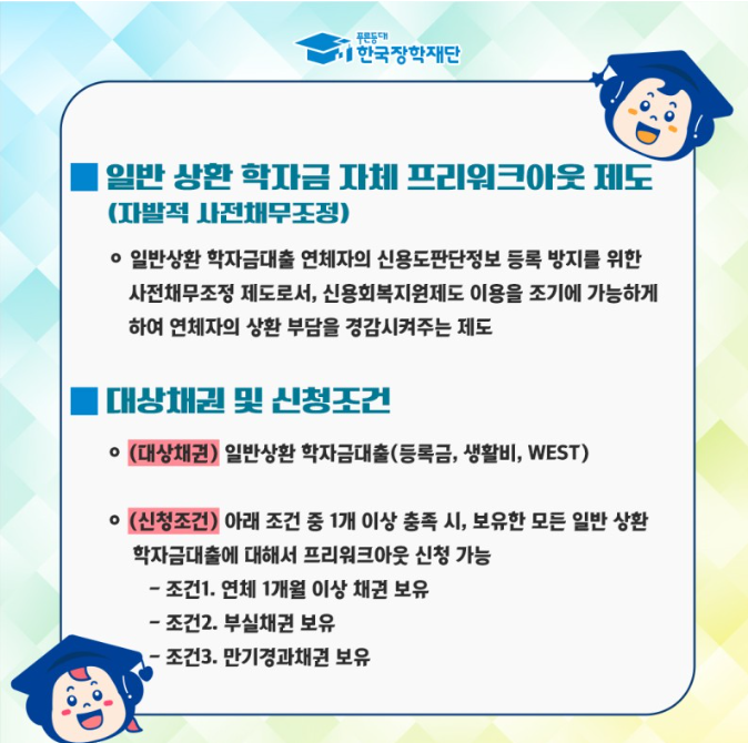 이 지원제도는 자발적 사전채무조정제도 또는 일반상환학자금대출, 사전 채무조정으로 프리워크아웃 제도라고도 합니다. 이는 학자금 대출 연체자의 신용회복지원제도를 조기에 이용 가능하도록 하며 연체자의 상환 부담을 경감해 주기 위한 제도입니다.