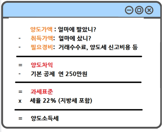 양도소득세가 얼마나 되는지 궁금하신 분들이 많을 것입니다. 양도소득세를 계산하는 방법은 다음과 같습니다. 먼저 매도가격에서 매수가격을 뺀 후 필요 경비를 차감합니다. 필요 경비에는 거래 수수료 같은 비용이 포함됩니다. 그 후에 기본 공제액인 250만 원을 차감한 금액이 과세 표준이 됩니다. 이 과세 표준에 22%의 세율을 곱하면 최종 세액이 계산됩니다.