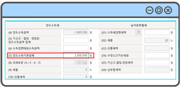▷기본공제 : 150만 원 - 250만 원 = 0 (과세 표준 없음)