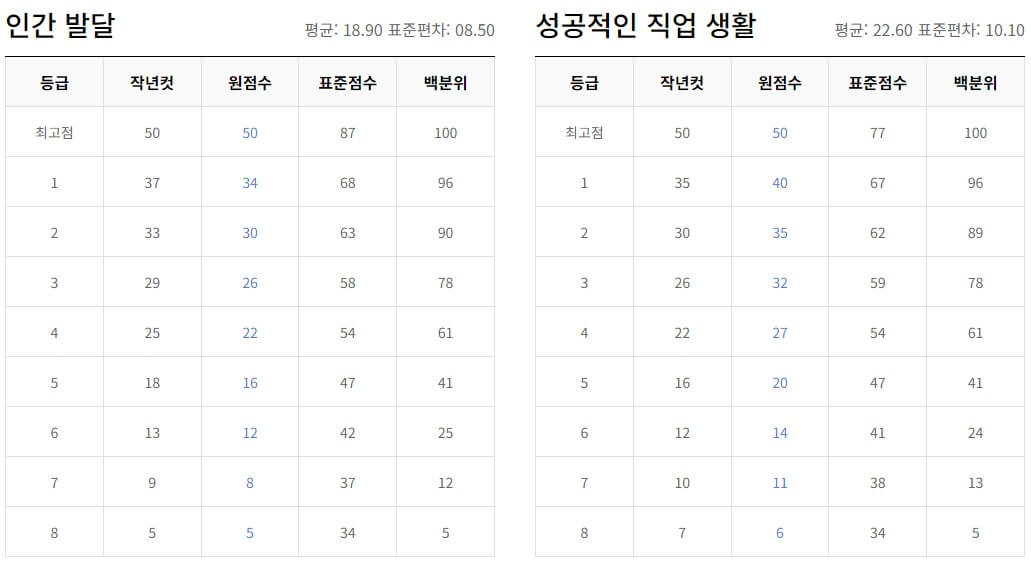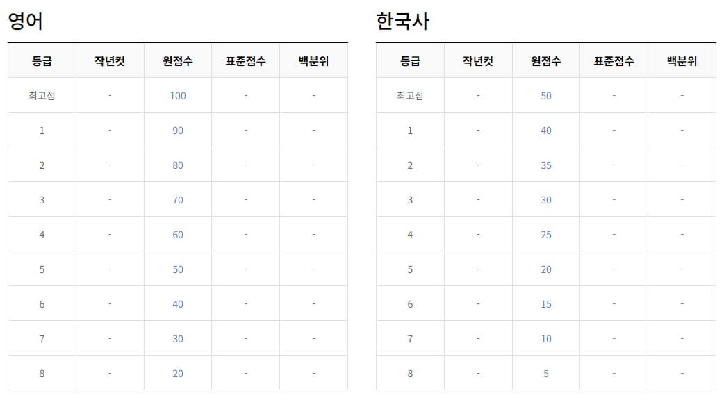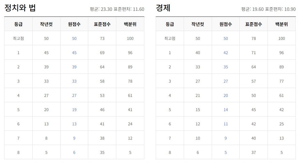 아직 영어와 한국사는 등급컷이 정리가 안된 상태입니다. 국어는 전체적으로 약간 낮아진 추세이고 수학은 전년도와 비슷하며 1점 정도 차이를 보이고 있습니다.