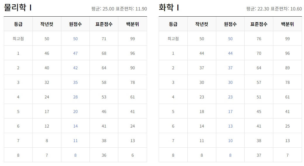 물리학과 생명과학, 지구과학은 약간 오른 것을 확인할 수가 있습니다. 화학은 약간 떨어졌지만 물리학을 제외하고는 전반적으로 작년과 큰 차이는 없는 것으로 보입니다.