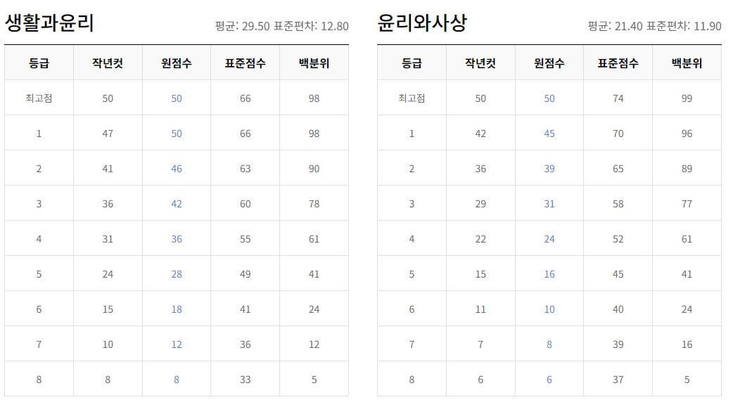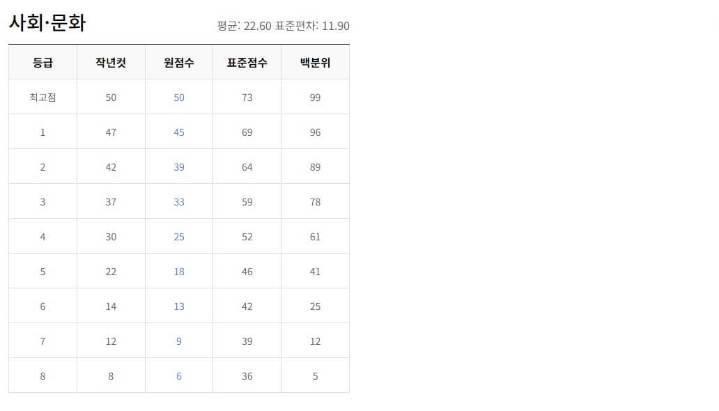 사회과목은 정치와 법 그리고 사회. 문화 을 제외하고는 전체적으로 상승세를 나타냈습니다. 특히 생활과 윤리에서 높은 것을 확인할 수 있었습니다.