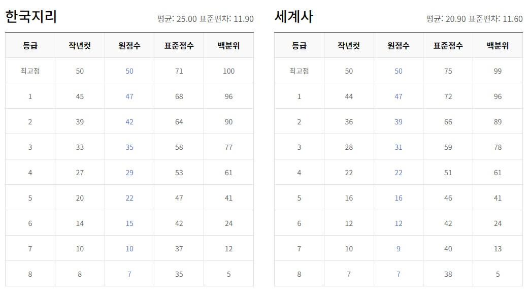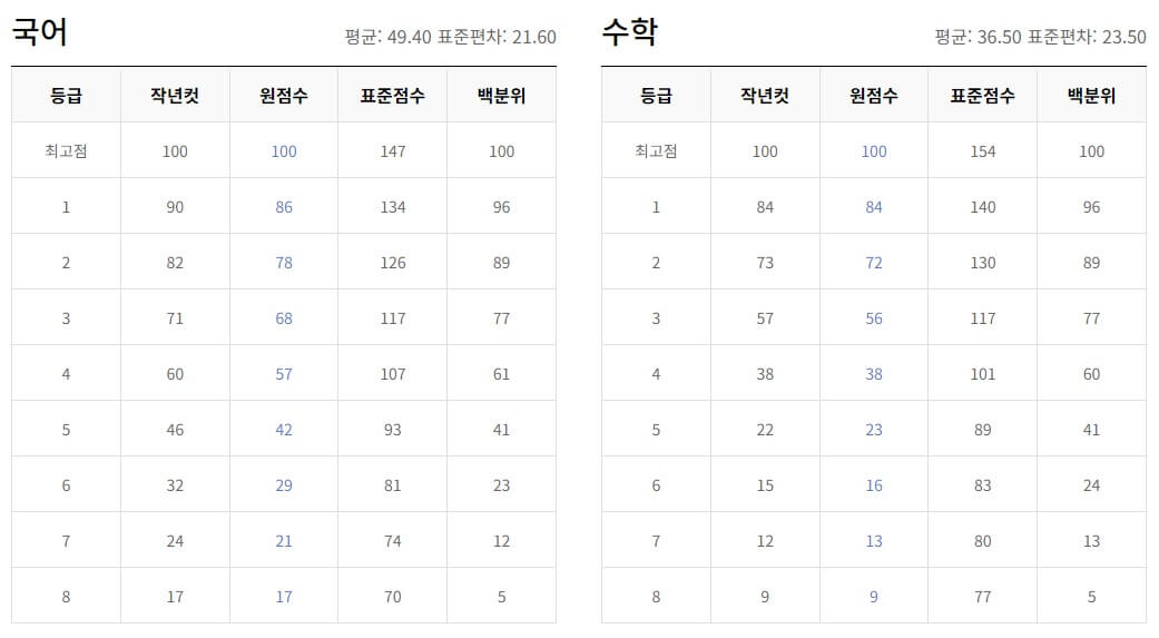 아직 영어와 한국사는 등급컷이 정리가 안된 상태입니다. 국어는 전체적으로 약간 낮아진 추세이고 수학은 전년도와 비슷하며 1점 정도 차이를 보이고 있습니다.