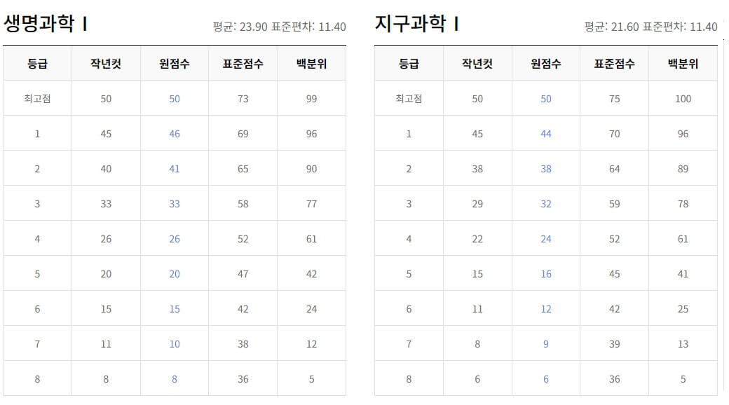 물리학과 생명과학, 지구과학은 약간 오른 것을 확인할 수가 있습니다. 화학은 약간 떨어졌지만 물리학을 제외하고는 전반적으로 작년과 큰 차이는 없는 것으로 보입니다.