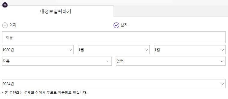 그럼 바로 신년운세 무료로 확인하는 방법부터 알아보도록 하겠습니다. 사이트 링크는 하단 버튼을 클릭하시면 바로 이동이 됩니다. 운세 보는 방법은 어렵지 않으며 기본적인 정보만 몇 개 입력하시면 됩니다.