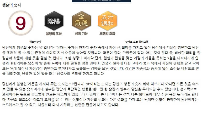마지막 내용은 행운의 숫자와 행운의 색에 대해서 알려줍니다. 저는 행운의 숫자가 9 가 나왔습니다. 참고로 불행의 숫자도 함께 알려주고 그 내용도 자세하게 설명해 주고 있습니다. 행운의 숫자가 9이기에 9월에는 무언가 좋은 결실을 맺을 수 있을 거라고 하네요.