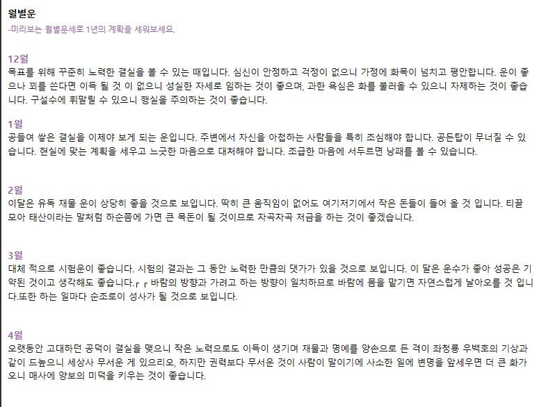 월별 운세도 상세하게 나오는데요. 종합운을 각 달별로 상세하게 알아볼 수 있습니다. 이거 하나만 보면은 월별운세를 따로 확인할 필요는 없겠네요. 운세를 100% 믿지는 않겠지만 그 운세를 보고 1년간의 방향을 한번 잡아보는 것도 좋을 것 같습니다. 나쁜 결과에는 미리 조심하고 좋은 결과는 기대를 하면서 좀 더 열심히 하면 그 운세에 부흥하는 결과가 나오지 않을까 합니다.