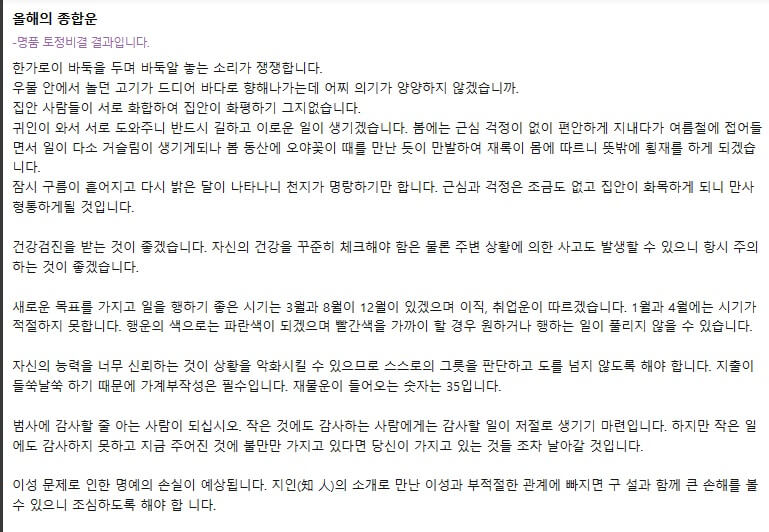 결과를 클릭하면 맨 처음 보이는 것은 종합운입니다. 이 운세는 토정비결을 토대로 결과가 나온다고 합니다. 올해 내 운세가 어떠한지 종합적으로 알려주는 것인데요. 저는 올해 운세는 나쁘지 않은 것으로 나오네요. 다만 건강에 좀 더 신경을 써야 한다는군요 그렇지 않아도 요즘 건강에 신경을 못쓴 거 같은데 내년에는 좀 더 신경 쓰고 운동도 열심히 해야겠네요.
