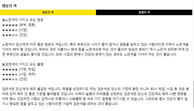 행운의 색도 행운의 숫자와 동일하게 결과내용을 상세하게 설명해 주며 불운의 색도 함께 알려줍니다. 행운의 색에는 어떤 행운을 가지고 오는지도 알려주는데요. 저는 부부, 사업, 건강에서 노란색이 좋게 나오고 있습니다. 그리고 불운의 색은 검은색으로 가정 또는 학업, 사업 또는 계약, 건강에서 불운의 색으로 나오고 있네요.