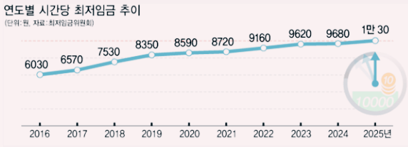 최조시급은 사회의 전반에 걸쳐 여러 분야에서 큰 영향을 주고 있는 요소 중 하나입니다. 2025년 최저 시급은 시간당 10,030원으로 결정이 되었습니다. 이는 2024년 최저 시급인 8,860원보다 170원(1.7%) 인상된 급액입니다. 언뜻 보면 얼마 아닌 것 같지만 고용주의 입장에서는 부담이 될 수밖에 없습니다. 이는 정부가 노동자들의 생계유지와 생활 수준 향상을 위한 정책으로 보이고 있지만 그 반대편의 부정적인 영향도 고려하지 않을 수가 없습니다.