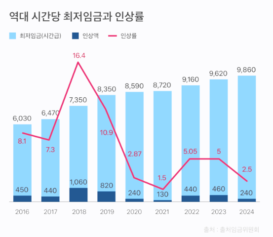 지난 최저시급의 변화를 보면 2018년도에 크게 오르는 것을 알 수 있으며 2024년도에는 9,860원까지 기록하였습니다. 그로 인해서 많은 변화들이 생겼습니다. 인건비 부담으로 인해 사업주는 인원 절감 또는 자동화 기계로 부담을 줄이려 노력하고 그 영향으로 고용의 불안과 실업률이 높아진 것 또한 사실입니다.