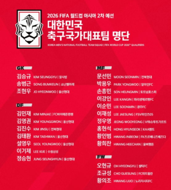 이번 월드컵 대표선수들은 손흥민 주장을 필두로 하여 총 23명이 선수 명단에 올렸습니다. 대표적인 선수로 이강인, 황희찬, 조규성, 황인범 등 쟁쟁한 선수들이 대거 포진해 있는 것을 보실 수 있습니다. 이강인 선수는 손흥민 선수와 트러블이 잠깐 있었지만 공식적인 사과로 분위기는 다시 좋아졌습니다.