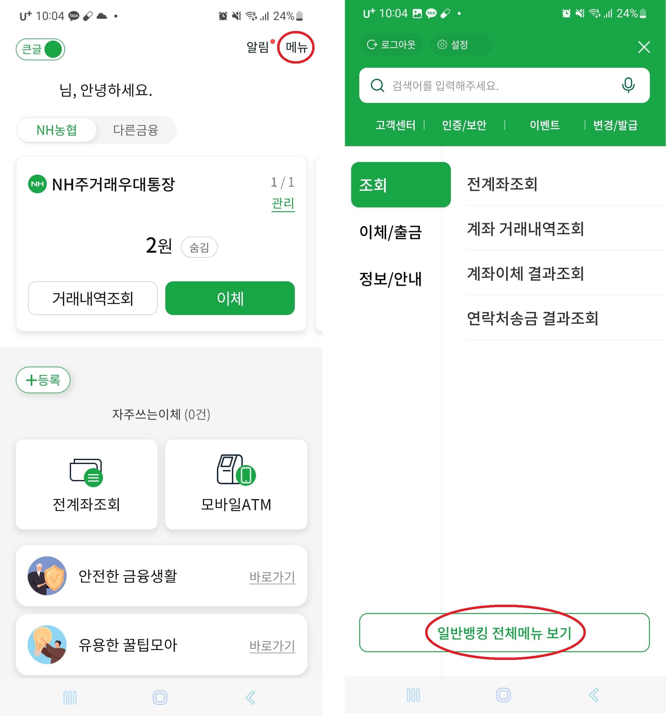 오른쪽 상단에 메뉴를 누르신 후에 화면이 바뀌면 하단에 일반뱅킹 전체메뉴 보기를 클릭합니다.