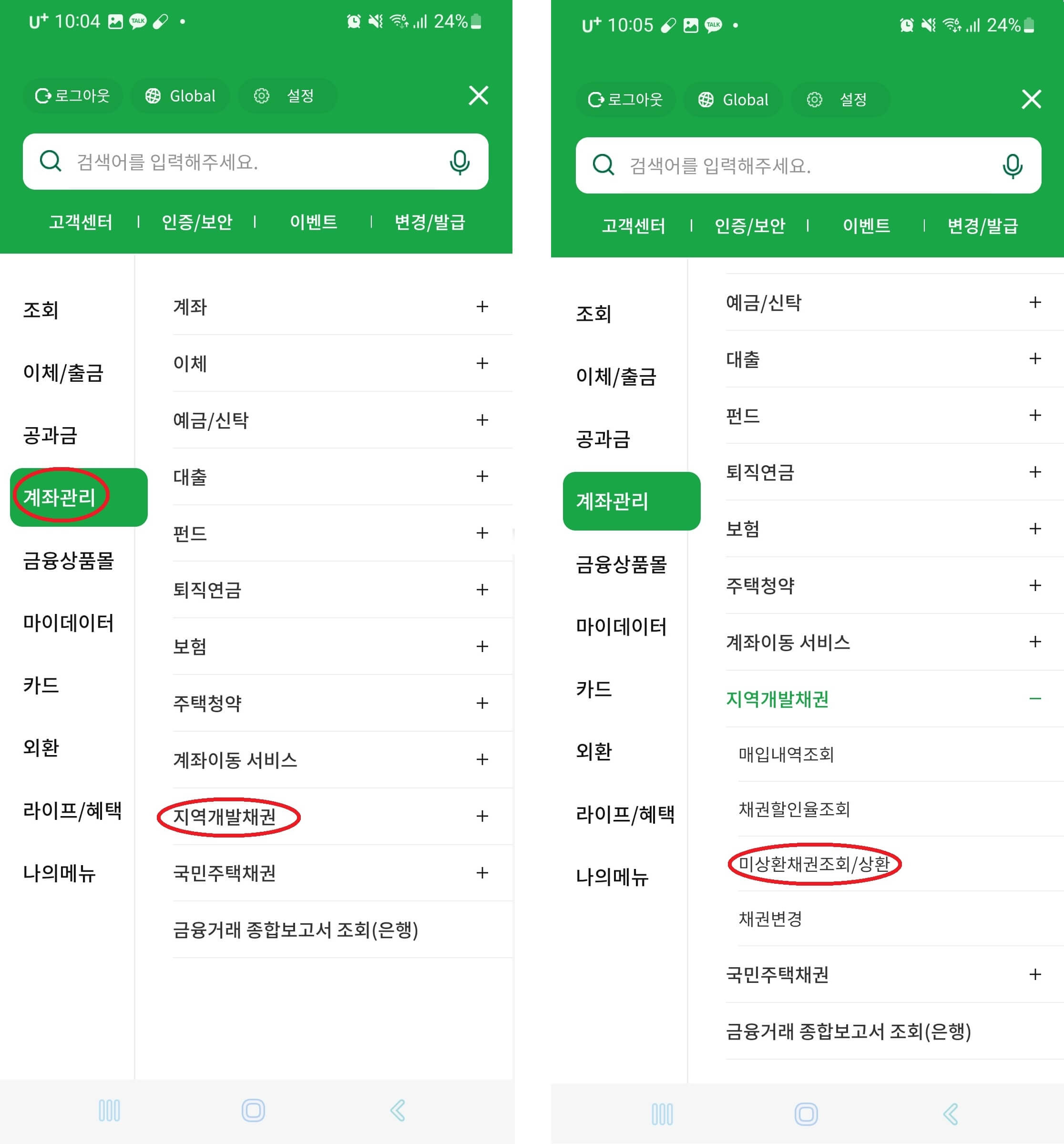 그런 다음 계좌관리에서 지역개발채권을 클릭하시고 미상환채권조회/ 상환을 클릭하시면 환급금 조회가 끝났습니다.